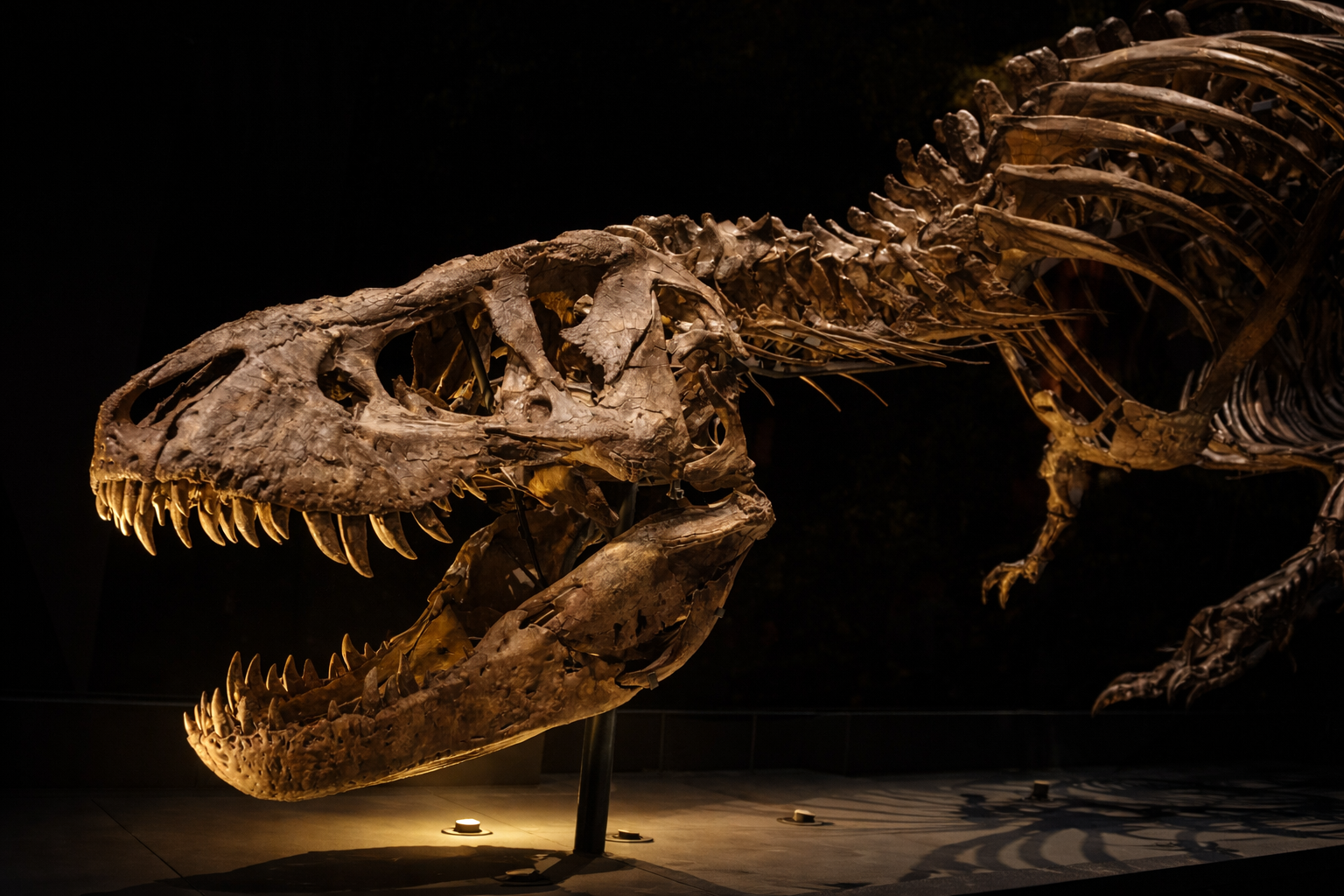 As night falls, the Tyrannosaurus Skeleton is dramatically illuminated, revealing the sheer scale and power of the world’s most famous predator. Every rib, claw and razor-sharp tooth is brought into focus, casting shadows that transform the bones into a haunting prehistoric spectacle.