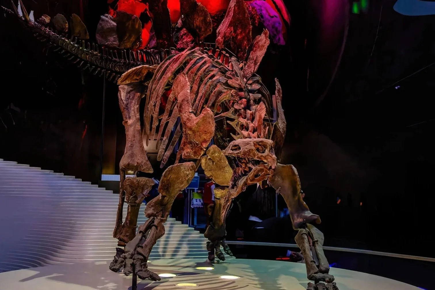 The Stegosaurus fossil is beautifully illuminated, highlighting its iconic plates, powerful tail and unique skeletal structure. Subtle lighting and shadow bring new depth to the fossil, revealing details often missed during the day.